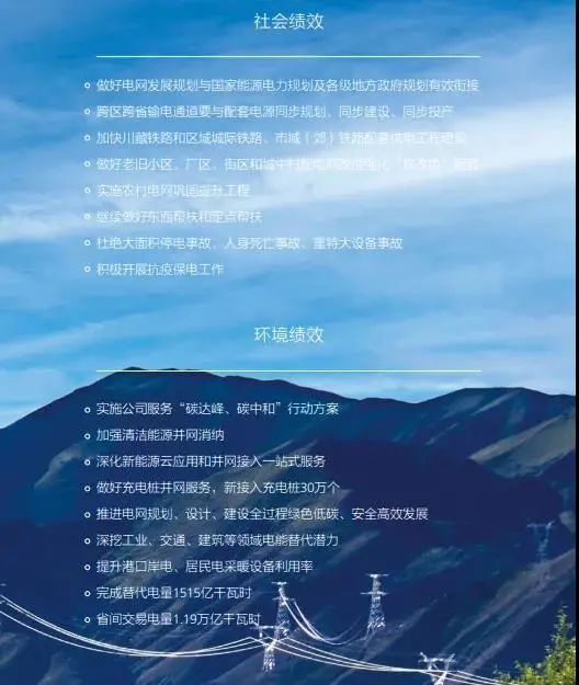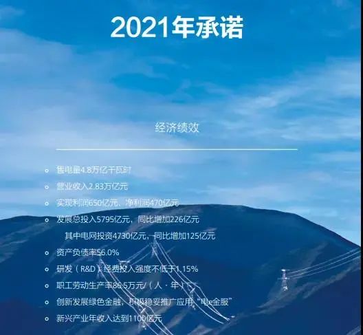 2021年承諾 · 實現利潤650億元、凈利潤470億元 · 發展總投入5795億元,同比增加226億元 其中電網投資4730億元,同比增加125億元 · 新興產業年收入達到1100億元 · 跨區跨省輸電通道要與配套電源同步規劃、同步建設、同步投產 · 做好充電樁并網服務,新接入充電樁30萬個 · 省間交易電量1.19萬億千瓦時