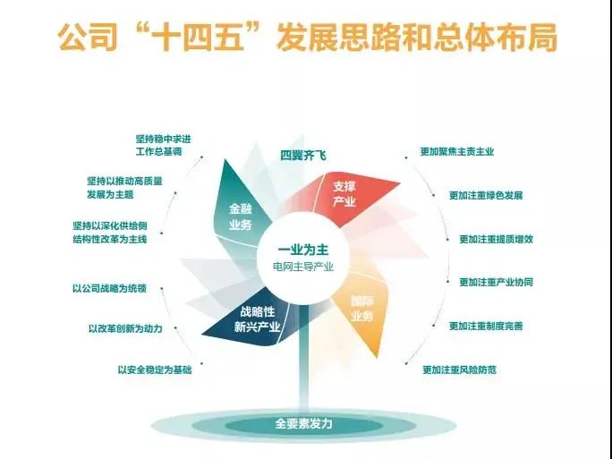 02履責意愿 “十四五”發展思路和總體布局 “一業為主、四翼齊飛” · 電網主導產業,支撐產業、國際業務、戰略性新興產業、金融業務四翼齊飛。
