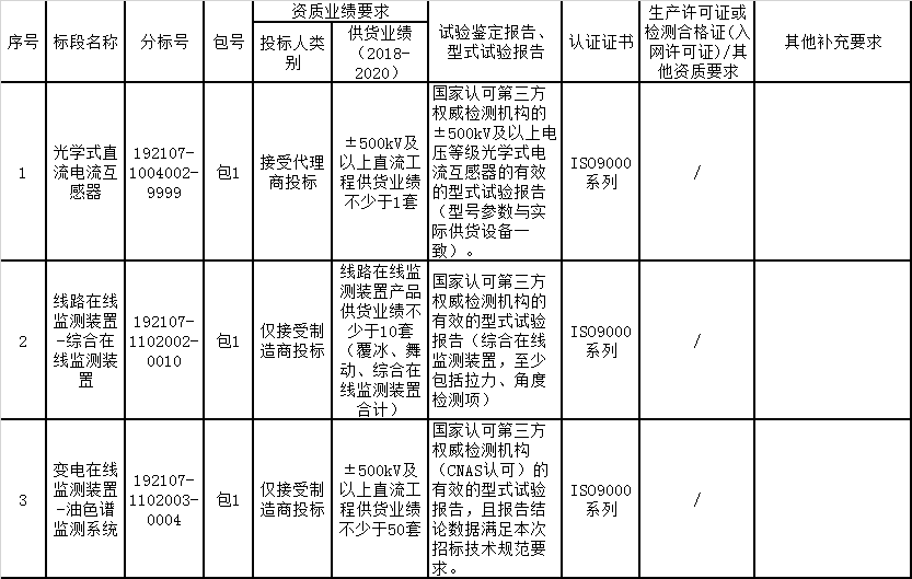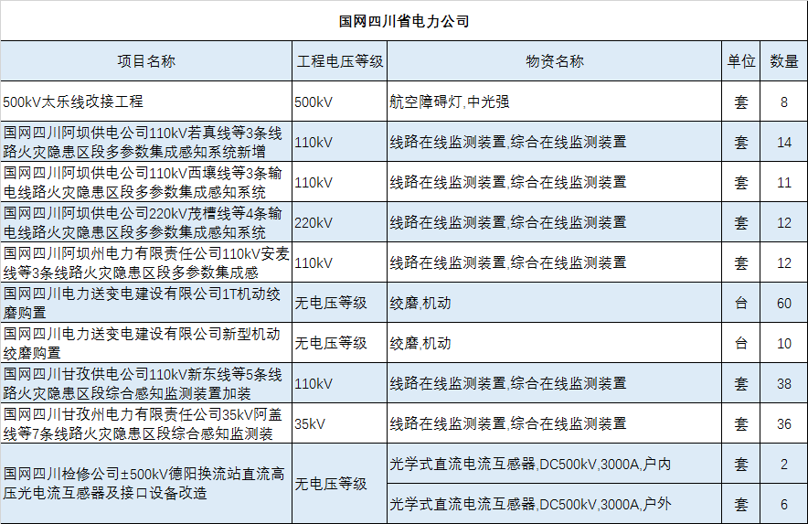 近日,國網四川省電力公司2021年新增第一次物資招標采購公告發布,采購項目編號:GWSC202102WZ07,采購物資包括:光學式直流電流互感器、線路在線監測裝置-綜合在線監測裝置、變電在線監測裝置-油色譜監測系統、航空障礙燈、絕緣涂料、絞磨、換流站極址用石油煅燒焦炭、電力電纜、變壓器油中溶解氣體在線監測裝置等。
