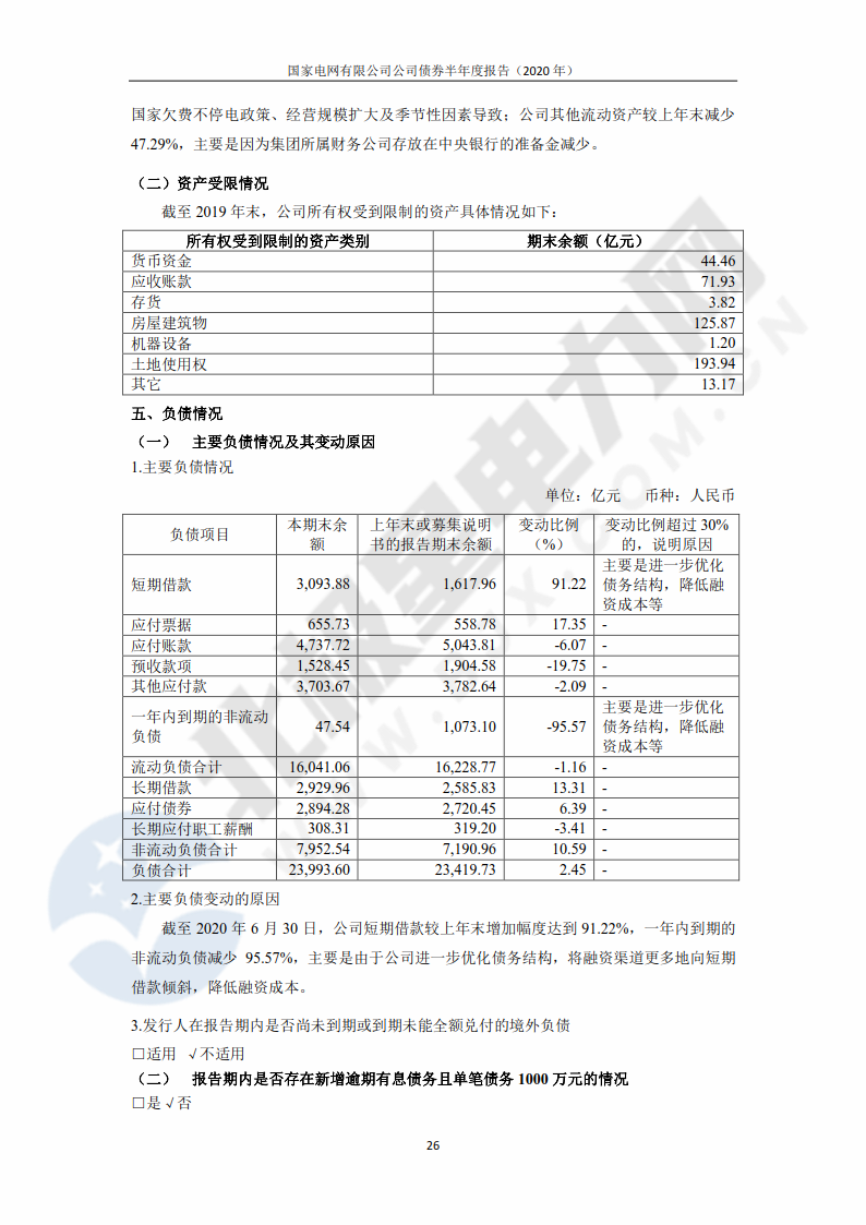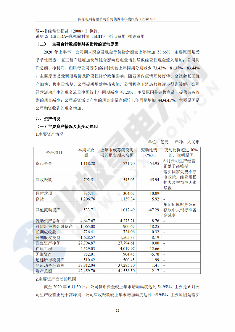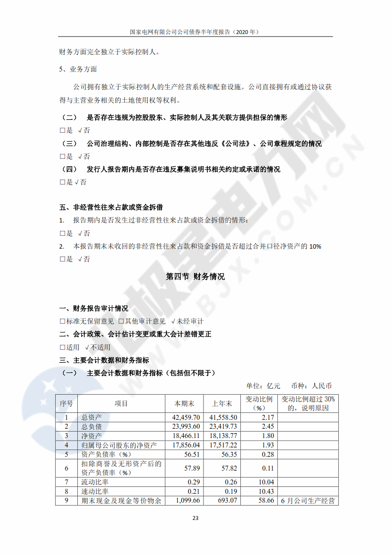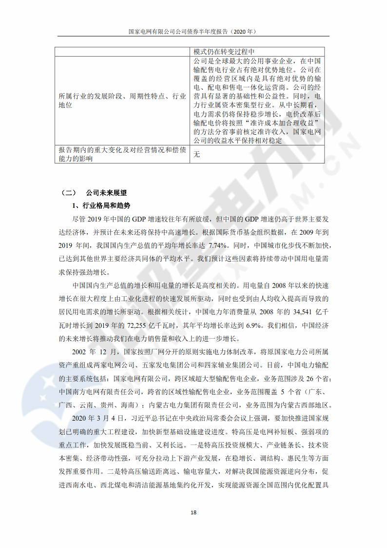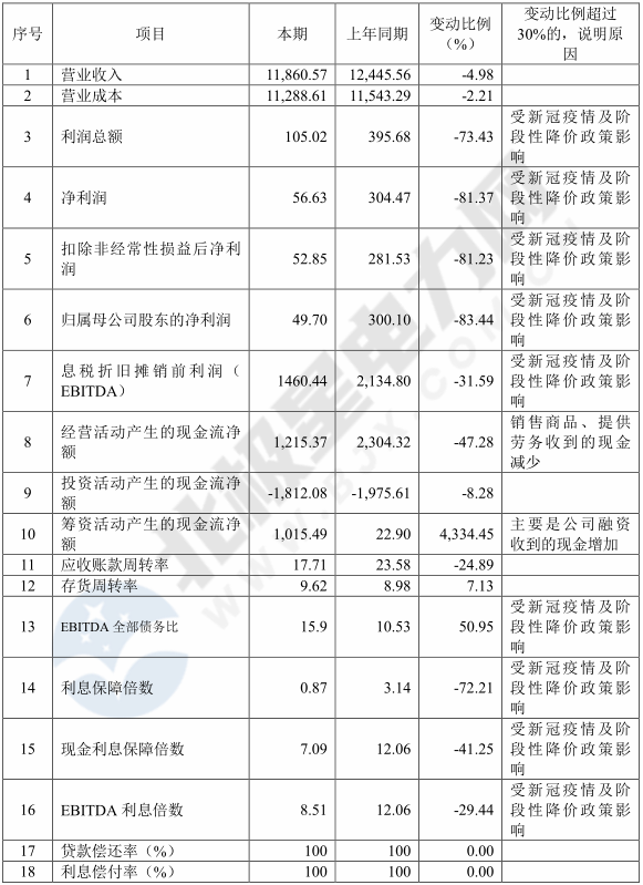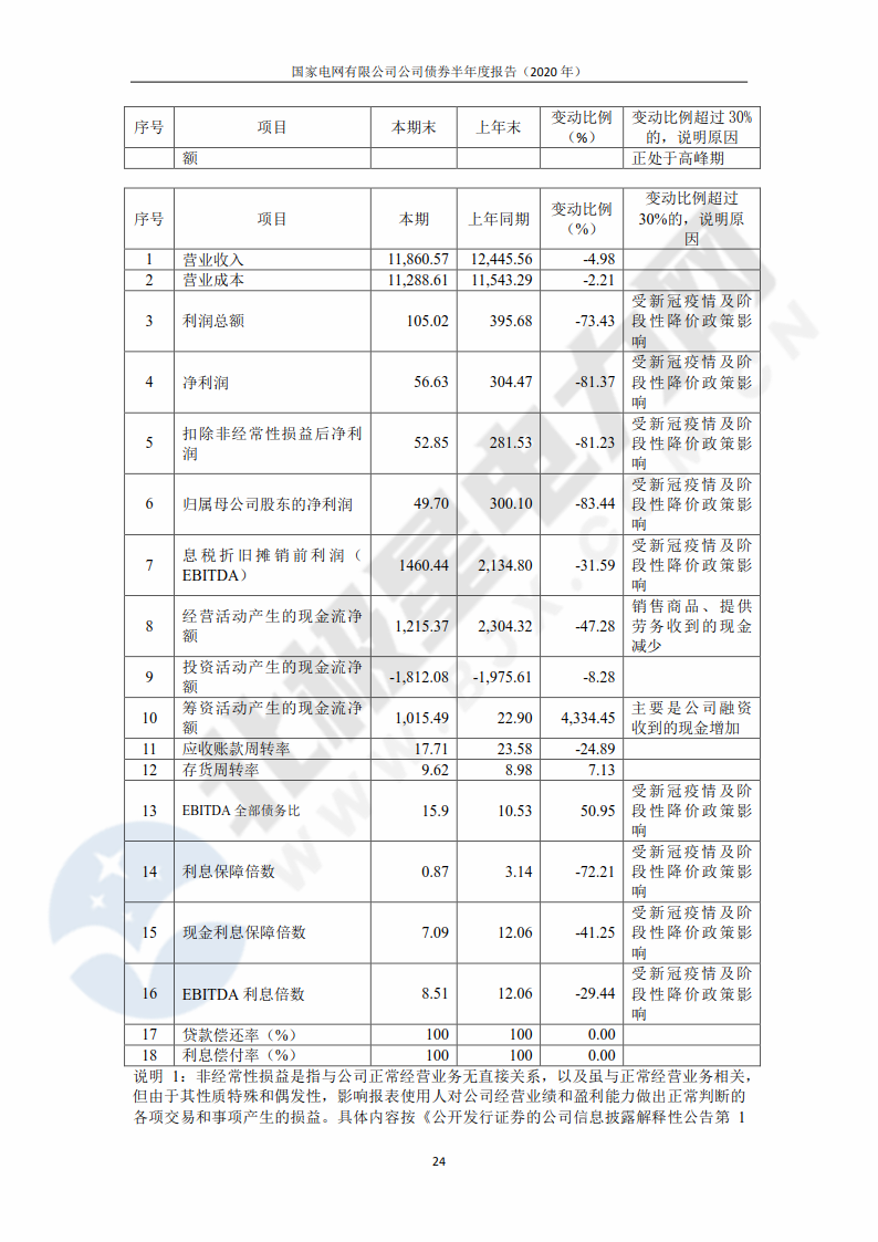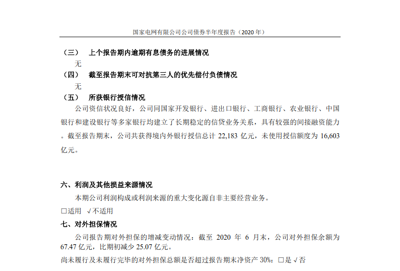 ![]() 8月28日,中央結(jié)算公司發(fā)布了《國家電網(wǎng)有限公司債券半年度報告(2020年)》,報告公布了國家電網(wǎng)公司上半年未經(jīng)審計的財務(wù)報告。 ![]() 報告透露,2020年上半年,國家電網(wǎng)公司資本支出約為1760.06億元。未來公司計劃繼續(xù)進行較大規(guī)模資本投入,主要用于國內(nèi)電力輸配工程建設(shè)。國家電網(wǎng)公司以往主要通過內(nèi)部資金、銀行貸款、發(fā)行境內(nèi)外債券等方式滿足資金需求,公司開展外部融資可能會受到一些外部不確定因素的影響。 報告顯示,截至2020年上半年,國家電網(wǎng)公司擁有總資產(chǎn)42459.7億元,總負債23993.6億元,分別較上年末增長2.17%和2.45%。2020年上半年,國家電網(wǎng)公司實現(xiàn)營業(yè)收入11860.57億元,比上年同期下降4.98%;營業(yè)成本11288.61億元,比上年同期下降2.21%;錄得凈利潤56.63億元,比上年同期下降81.37%。報告表示,上半年凈利潤下滑是受到了新冠疫情及階段性降價政策的影響。 報告稱,“隨著國內(nèi)疫情形勢好轉(zhuǎn)、全社會復(fù)工復(fù)產(chǎn)加快、售電量恢復(fù),公司提質(zhì)增效舉措實施,公司利潤下滑態(tài)勢將逐步得到緩解。” 單位:億元 幣種:人民幣