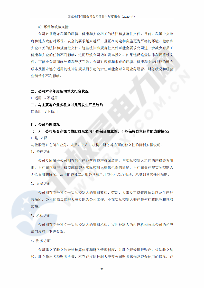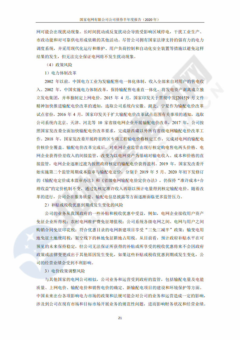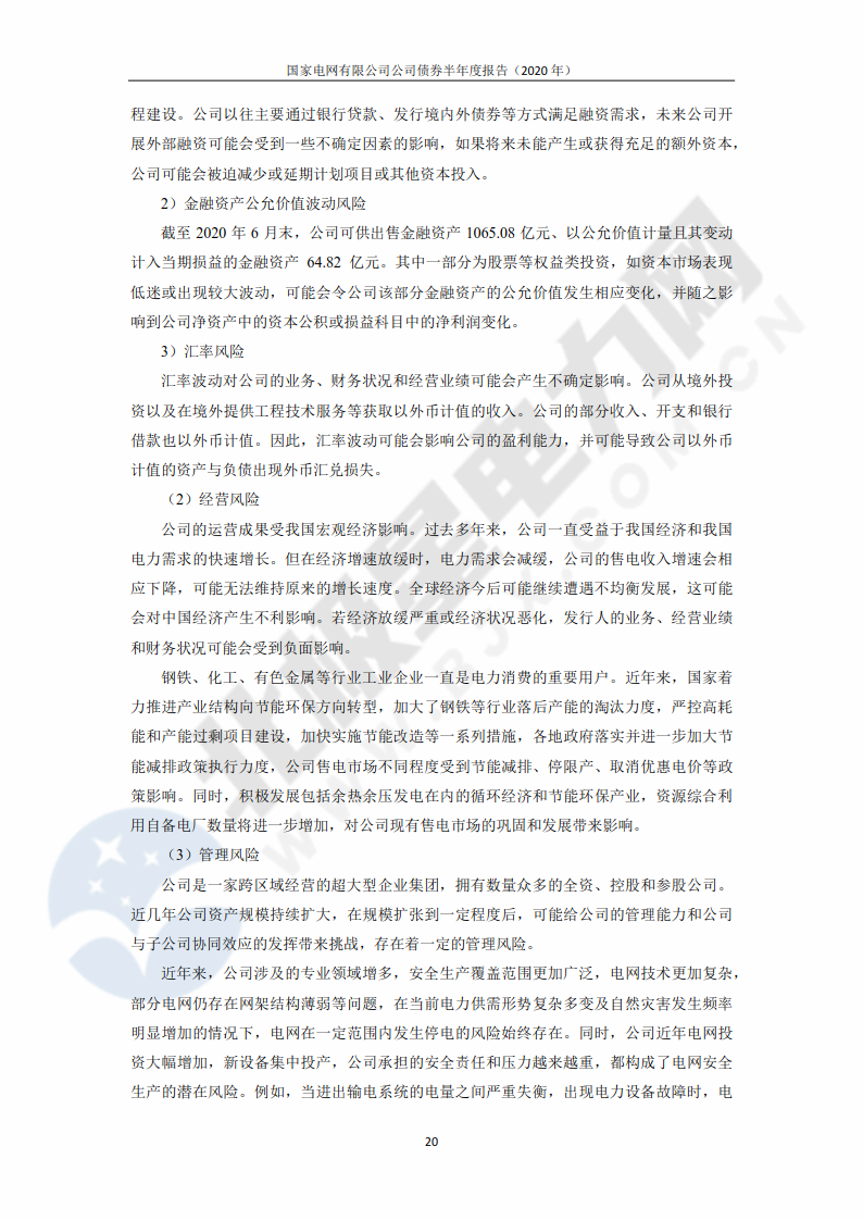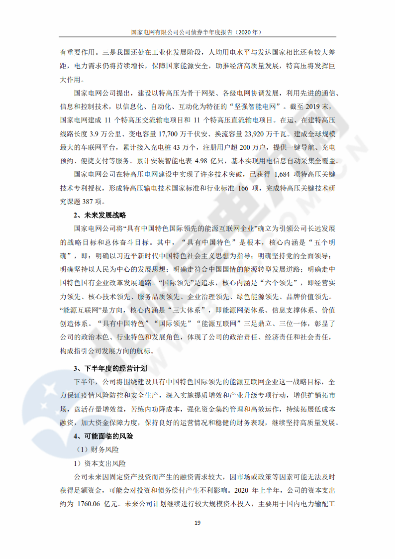 ![]() 此外,報告提出,下半年,國家電網(wǎng)公司將圍繞建設(shè)具有中國特色國際領(lǐng)先的能源互聯(lián)網(wǎng)企業(yè)這一戰(zhàn)略目標(biāo),全力保證疫情風(fēng)險防控和安全生產(chǎn),深入實施提質(zhì)增效和產(chǎn)業(yè)升級專項行動,增供擴銷拓市場,盤活存量增效益,苦練內(nèi)功降成本,強化資金集約管理和高效運作,持續(xù)拓展低成本融資,加大資金保障力度,保持良好的運營情況和穩(wěn)健的財務(wù)表現(xiàn),繼續(xù)堅持高質(zhì)量發(fā)展。 報告還明確了國家電網(wǎng)公司發(fā)展可能面臨的風(fēng)險,包括財務(wù)風(fēng)險、經(jīng)營風(fēng)險、管理風(fēng)險、政策風(fēng)險。