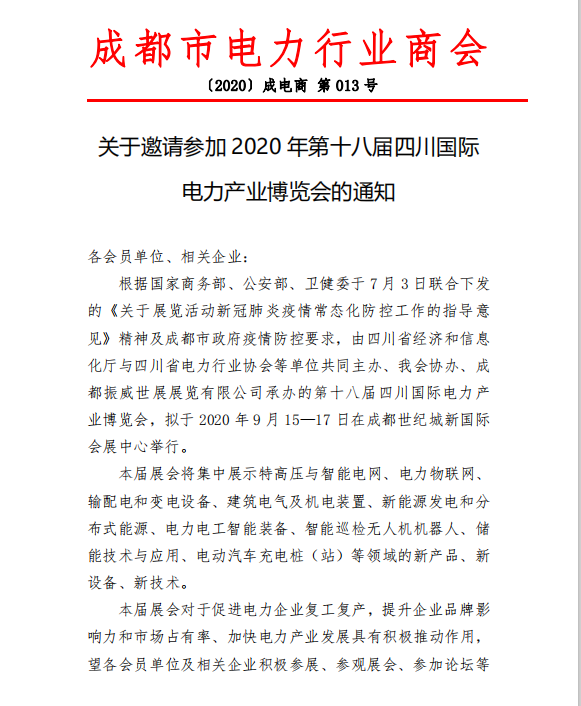 成都市電力行業商會關于邀請參加第十八屆四川國際電力產業博覽會的通知