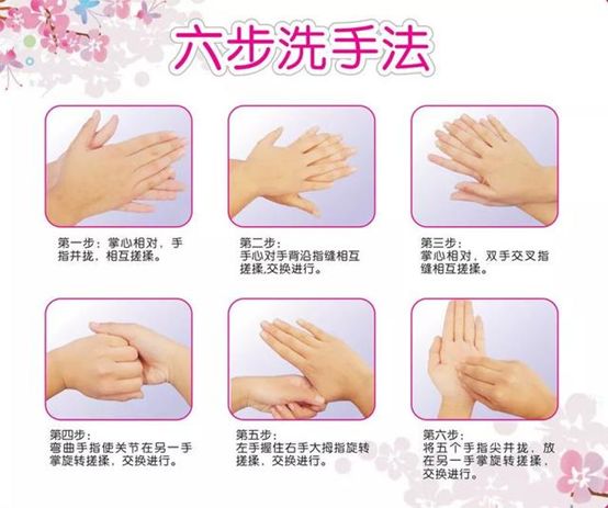 流水肥皂或者手消毒劑洗手,六步洗手法,更嚴格的是七步洗手法。每個步驟5次,不少于15秒,流動水洗手。