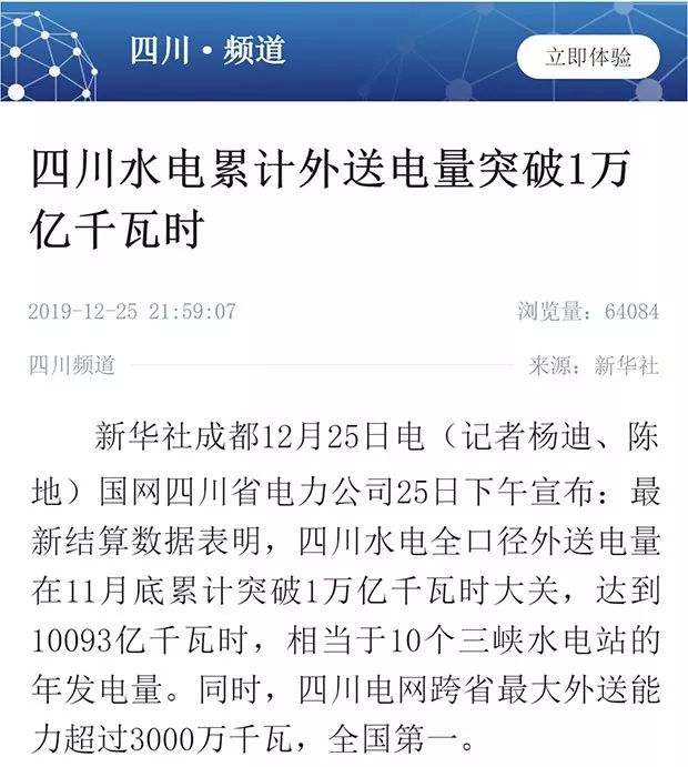 牛氣!四川水電累計外送電量破“1萬億度”,堪比十個三峽年發電量發表時間:2019-12-26 18:18作者:馬上來電