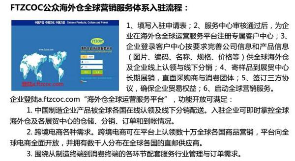 據悉,在國家商務部中歐協會互聯網貿易委員會的合作支持下,海外倉集團積極踐行國家戰略,依附“一帶一路”藍圖,聯合各國著名華商組織、世界知名企業及當地貿促機構,努力打造FTZCOC公眾海外倉全球營銷服務體系。截至目前,已成立了捷克、荷蘭、愛爾蘭、法國、英國、日本、非洲、美國等共45個公眾海外倉(目標到2018年完成全球200家),歐洲、中東、中亞等中國產品展貿中心;并在全國已經設立了19家企業服務中心,全面服務中國企業產品進入國際市場,實現全球營銷。 FTZCOC公眾海外倉改變海外倉以往一司一倉、單一倉儲功能的局限,為企業提供報關、清關、準入認證、品牌展示、市場分銷、物流配送、產品退換、材料采購、知識產權、貨款保障等健全、配套的貿易服務,很大程度解除了中國企業開拓國際市場難,物流成本高,交易周期長,受海外貿易商的制約和壓榨等不利因素,企業通過一站式進駐公眾海外倉全球服務體系,足不出戶使產品進入國際市場。 進入FTZCOC公眾海外倉全球服務體系的參展企業產品均可免費進駐歐洲、中亞等中國產品展貿中心進行長期的展銷,通過展貿中心舉辦的各種訂貨會、推介會等活動,吸引當地及周邊國家的采購商、連鎖商超、批發市場等商人與企業采購商品。同時,優先參加公眾海外倉各展貿中心組織的各類國際商務交流活動,并獲得海外倉集團所爭取到的優惠政策和政府各項支持,優先享受相關海外倉基金的資金扶持。 通過本土化線下分銷的模式,使產品直接走進了當地實體超市和大型商品市場,直接面對海外消費者,大大提高了企業產品在各國的銷售及品牌知名度。企業通過以自有品牌和自主定價將產品直接覆蓋亞非拉美歐,實現全球營銷,實現企業利益的最大化,實現了企業產品銷售海外的品牌權、定價權、話語權。同時也克服了中國現有跨境電商平臺被動銷售的局限和渠道單一的弊端。