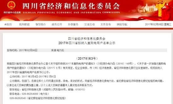 四川省經(jīng)信委公示2017年擬納入直購(gòu)電用戶名單 看看有沒(méi)有你家企業(yè)?發(fā)表時(shí)間:2017-02-08 16:02