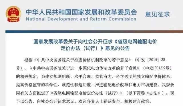 重磅 | 發(fā)改委就《省級(jí)電網(wǎng)輸配電價(jià)定價(jià)辦法(試行)》征求意見(附文件全文)發(fā)表時(shí)間:2016-11-17 16:21
