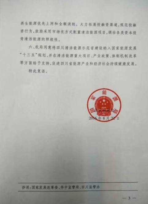 國家能源局近日發(fā)布《關(guān)于四川省創(chuàng)建國家清潔能源示范省有關(guān)事項(xiàng)的復(fù)函》。復(fù)函同意將四川清潔能源示范省建設(shè)納入國家能源發(fā)展“十三五”規(guī)劃,支持四川清潔能源示范省建設(shè)。此外還指出,四川要在提高水電調(diào)節(jié)能力基礎(chǔ)上,規(guī)劃建設(shè)風(fēng)電光伏發(fā)電基地,形成水、風(fēng)、光互補(bǔ)的現(xiàn)代化電力系統(tǒng),大幅度提高可再生能源發(fā)電的可靠性和靈活性。提高清潔能源在能源消費(fèi)中的比重,力爭2030年非化石能源消費(fèi)在一次能源消費(fèi)比重達(dá)到50%。以下為具體函文: