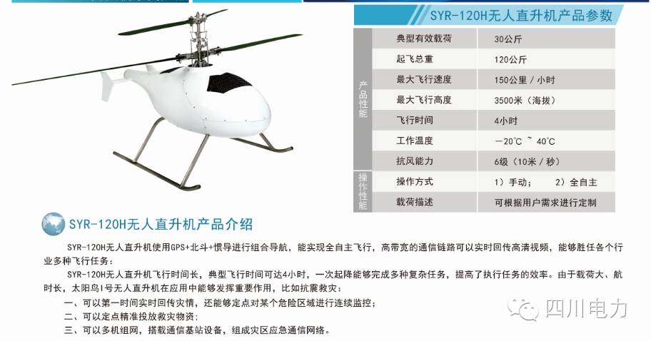 SYR-120H號無人機使用GPS+北斗+慣導進行組合導航,能實現全自主飛行,高帶寬的通信鏈路可以實時回傳高清視頻,典型的飛行時間可達4小時,一次起降能夠完成多種復雜任務,提高執行任務的效率,能夠勝任各個行業多種飛行任務:遠程邊防巡邏、遠程緝毒查毒、森林防火巡查、農藥噴灑、抗震救災、公共設施(電力巡線、石油管線)巡查、專業影視拍攝、遙感探礦、電力架線、搜索救援、物資運輸等行業。