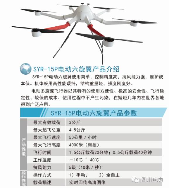 電動多旋翼飛行器以其特有的使用方便性、極高的安全性、飛行穩定性、較低的成本、使用過程中不產生污染,在短短幾年內在世界各地得到廣泛應用。 SYR-15P六旋翼使用簡單,控制精度高,抗風能力強,維護成本低。機體采用高性能碳纖,結構重量輕,強度剛度好。可廣泛應用于:航空攝影、火情監測、熱點區域監控、反恐維穩、電力巡檢等行業。