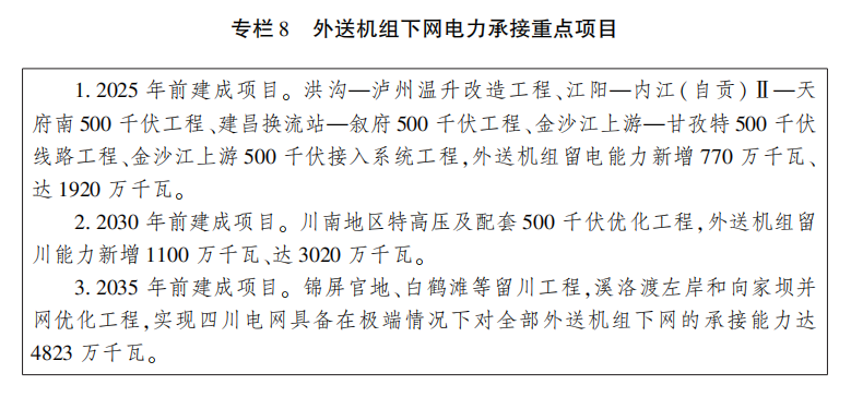 圍繞“進得來” 加快外電入川通道建設。推動區域電網互聯互通,引入省外穩定可靠電源,增強省際間多元化、多方向互濟能力,提高四川電網與西北電網、西藏電網互通水平和互濟能力。 圍繞“接得住”增強外送機組下網電力承接能力。到 2025 年,外送機組留電能力新增 770 萬千瓦、達到1920萬千瓦。